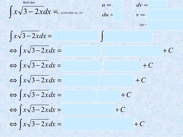 Integral dengan teknikmetode substitusi digunakan ketika proses pengintegralan tidak bisa diselesaikan. Contoh 1 x 2 x.